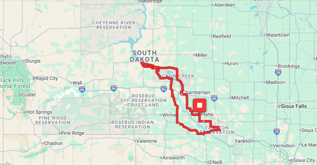 A highlight of the route is the Geddes Historic District, listed on the National Register of Historic Places. Here we’ll see the Papineau Trading Post, built in 1857 and believed to be one of the oldest surviving buildings in South Dakota, along with numerous other historic structures that reflect the region’s early settlement and railroad heritage. Our journey comes full circle as we complete the loop and return to Platte, wrapping up a day that blends scenic riding with a strong sense of place and history.